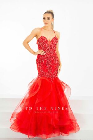 A beautiful ballgown with a ruffle bodice and an extreme ruffle shoulder detail.